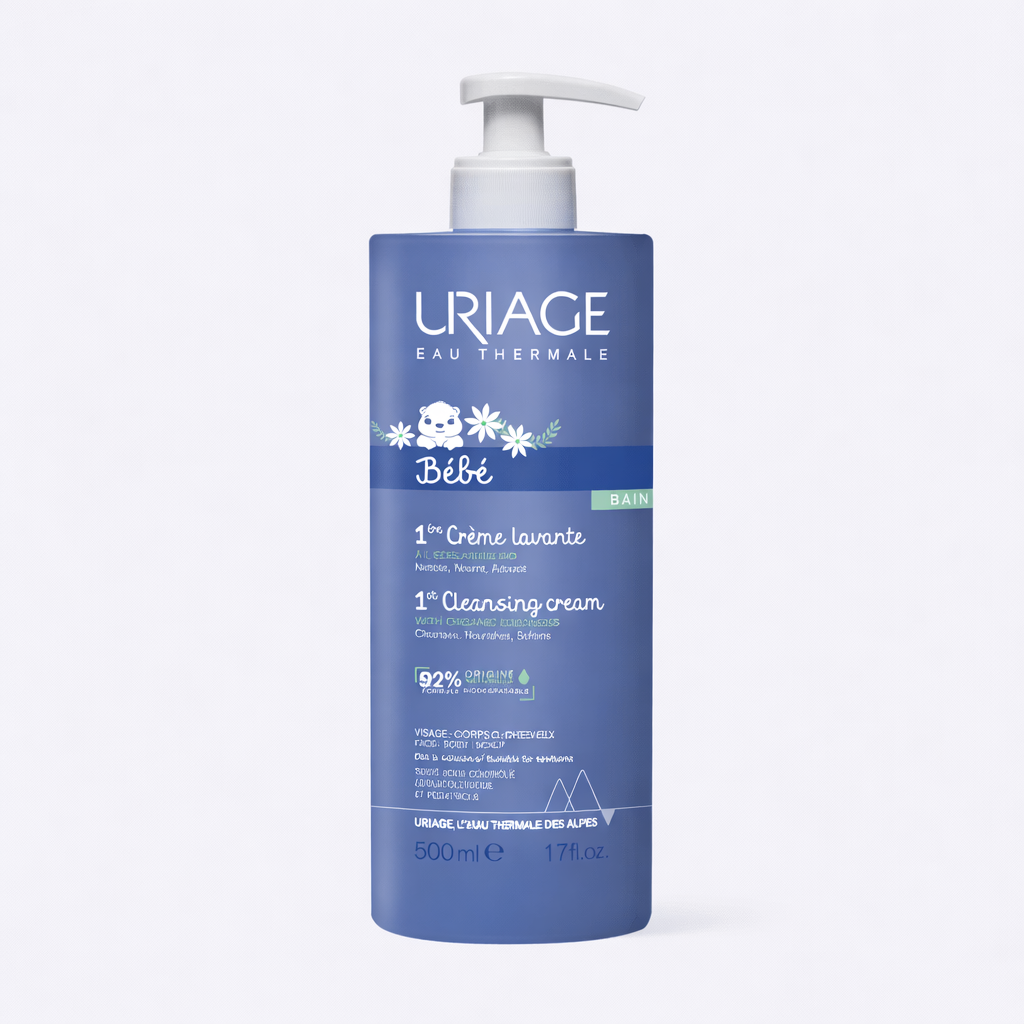 Uriage Bébé 1ère Crème Lavante 500 ml est un soin lavant bébé doux qui nettoie le visage, le corps et le cuir chevelu tout en respectant la peau sensible.