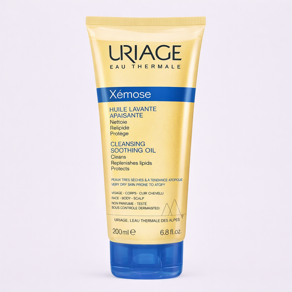 Uriage Xémose Huile Lavante Apaisante est un soin lavant visage et corps qui nettoie en douceur, apaise les démangeaisons et protège les peaux très sèches à tendance atopique.