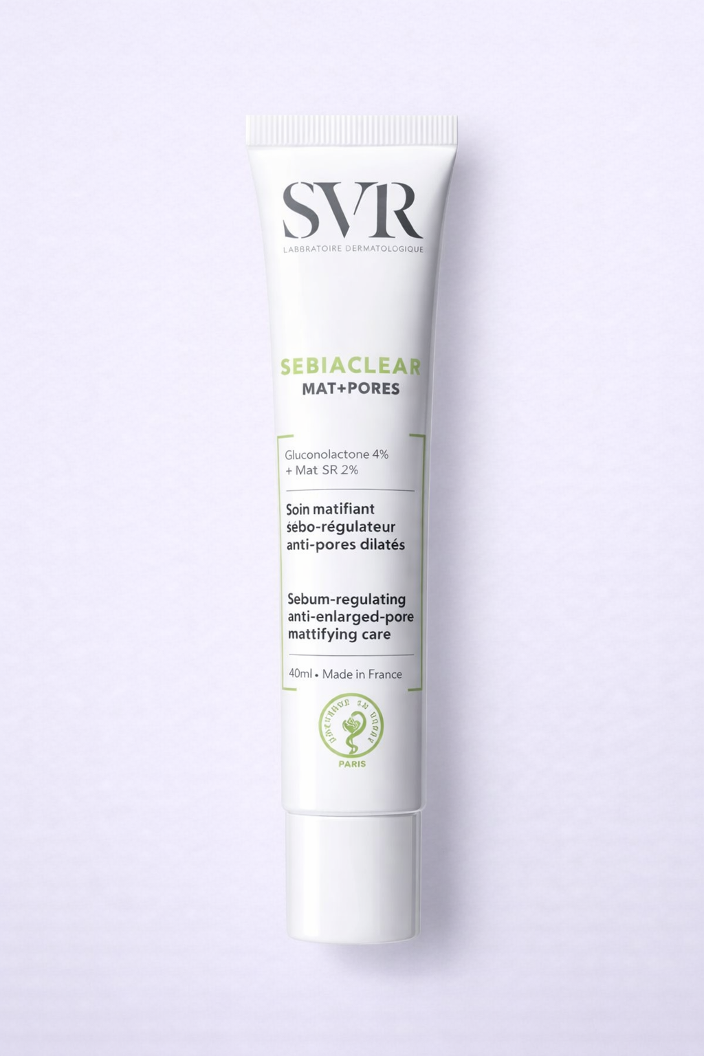 SVR Sebiaclear Mat+Pores soin matifiant est un soin visage conçu pour réduire la brillance et affiner l’apparence des pores. Dès l’application, la peau paraît plus mate et plus lisse. Ainsi, ce soin s’intègre facilement dans une routine SVR visage proposée par SVR Tunisie. Le produit SVR Sebiaclear Mat+Pores soin matifiant ou svr sebiaclear matpores soin matifiant répond parfaitement aux besoins des peaux mixtes à grasses.