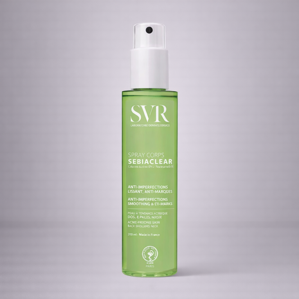 SVR Sebiaclear spray corps anti imperfections aide à réduire boutons et imperfections sur le corps. Un soin ciblé pratique proposé par SVR Tunisie.