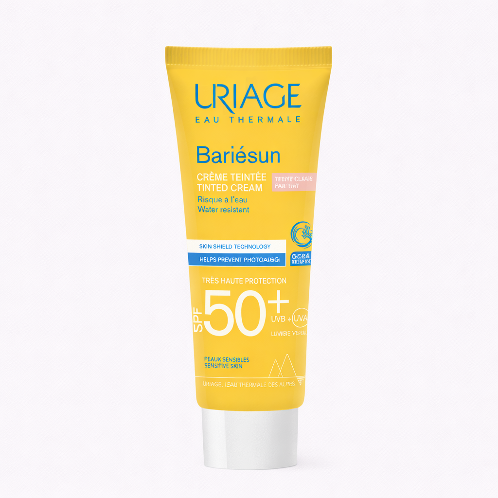 Uriage Bariésun Crème Solaire Teintée Claire SPF50+ est un soin solaire visage Uriage en Tunisie conçu pour protéger la peau sensible tout en unifiant le teint clair.